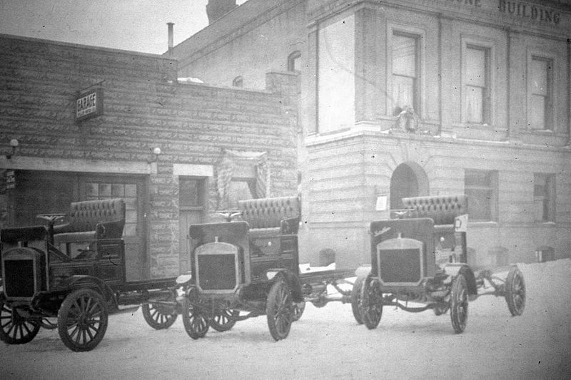 Three Piggins trucks parked in front of the Miller Motor Co. garage at 619 Main Street, Racine. Undated.