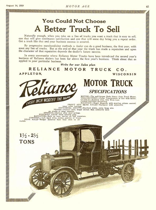 Reliance truck advertisement in 1919: this vehicle was apparently the successor to the Piggins truck.