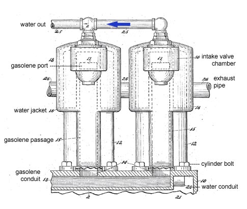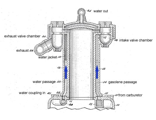 Advantages resulting from the casing construction of this [engine] are that the passages for the explosive mixture being within the cylinder walls are thereby kept heated during the operation of the engine and give to the gas passing there through a preliminary heating which results in a more efficient operation than would otherwise be the case. Also, because of the water passages being located within the cylinder walls and the water conduit being located within the crankcase, there is less liability of the water freezing than when it is conducted to the water jackets through exposed tubes.