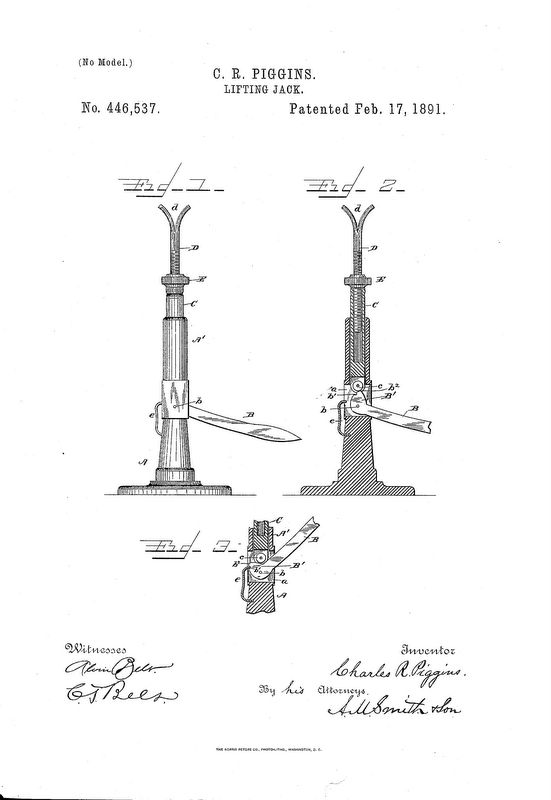 The first patented Piggins invention: a screw-driven lifting jack which locked itself into position.