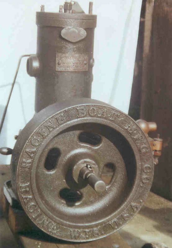 A surviving Piggins marine engine with an embossed Racine Boat Mfg. Co marking cast into the flywheel: front side.
