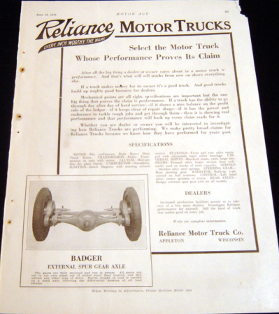 Badger external-spur-gear axle in Motor Age 1919-04-13, shown in a Reliance Truck advertisement